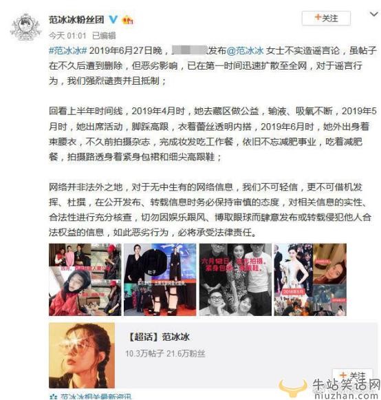 网络并非法外之地,对于无中生有的网络信息,我们不可轻信,更不可借机发挥、杜撰,在公开发布、转载信息时务必保持审慎的态度,对相关信息的实性、合法性进行充分核查,切勿因娱乐跟风、博取眼球而肆意发布或转载侵犯他人合法权益的信息,如此恶劣行为,必将承受法律责任。”欲了解范冰冰粉丝团辟谣范冰冰与上得基董事长吴铁军的怀孕之谈!的更多资讯,请持续关注牛站的八卦新闻栏目,牛站小编将持续为您更新更多的八卦新闻。