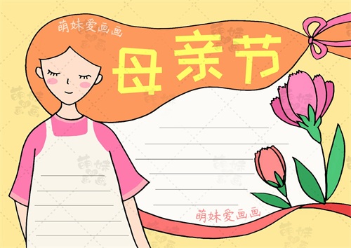 我们绘制一位妈妈的形象作为手抄报的主视觉,妈妈飘起的头发作为手抄报的报头文字框,在画面周围点缀一些康乃馨和丝带,这样的设计简单又好看。