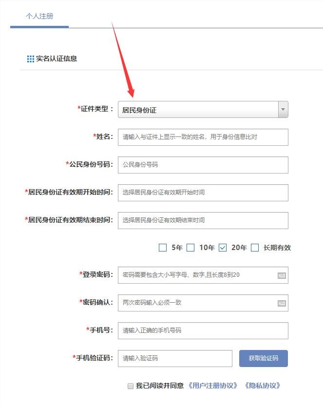 六、选择“证件类型”,填写个人信息,填写完成后获取验证码,点击注册。