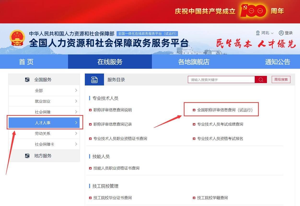三、点击下图左侧的“人事人才”,然后右侧选择“全国职称评审信息查询(试运行)”