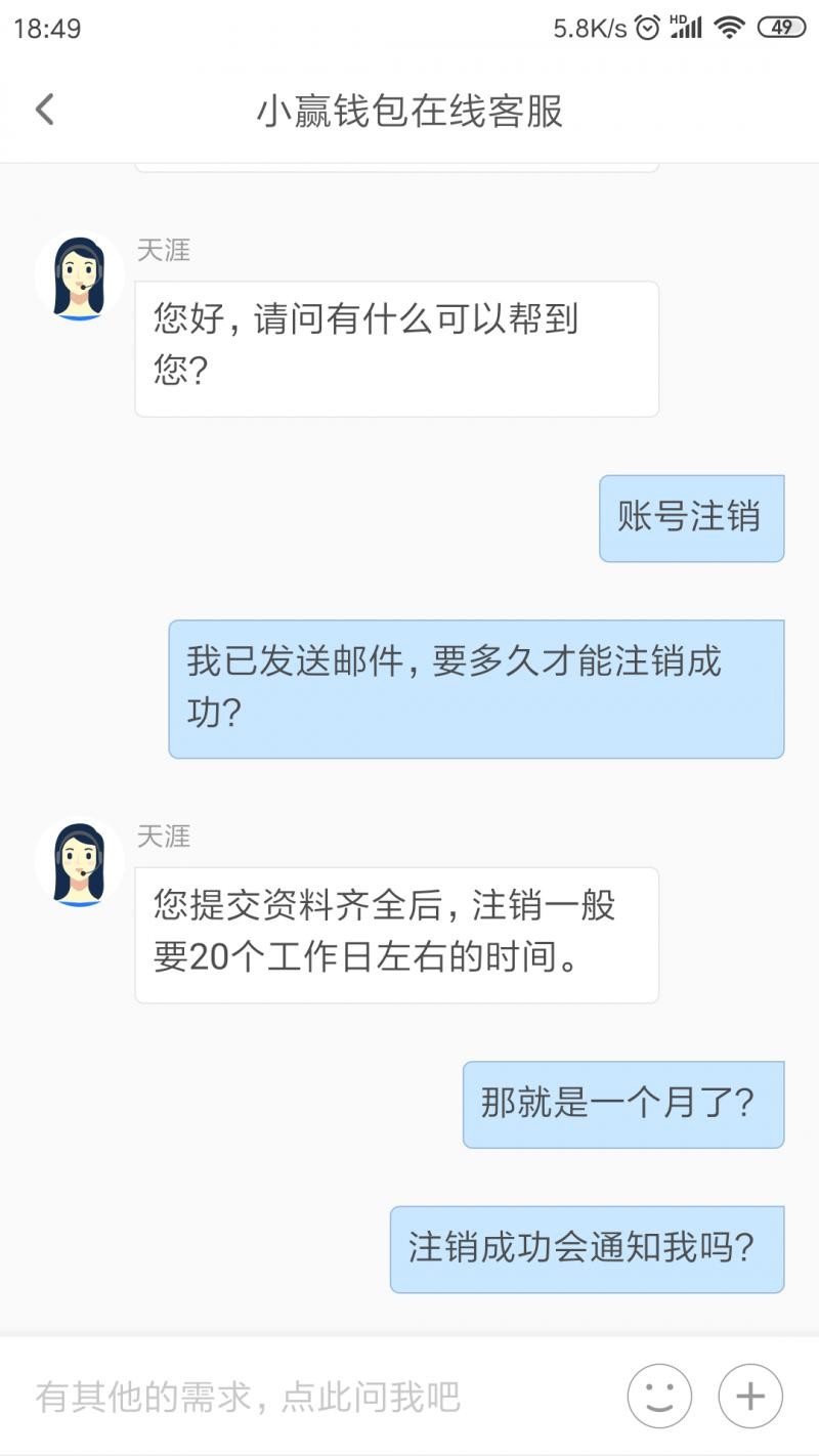 北青金融注意到,在某投诉平台上,小赢钱包账户注销问题被诟病。据龙先生的投诉,在结清小赢钱包账单以后,想注销账号,被客服告知提供半年的银行卡流水等信息,在提供资料后,却被告知要等待20个工作日,再办理注销账号。