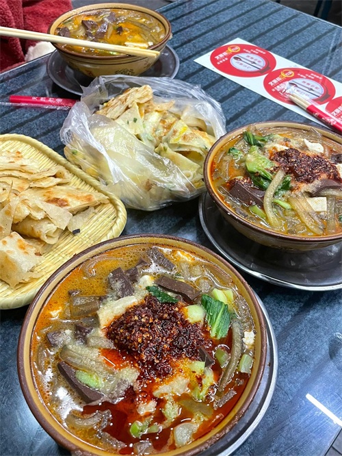 扁粉菜,安阳人早餐的最爱之一。以红薯粉条为主料,搭配豆腐、青菜、猪血等食材,在大铁锅中炖煮而成。满满一大碗扁粉菜,热气腾腾,香气扑鼻。粉条爽滑有劲道,配菜丰富多样,再加上一勺辣椒油,那滋味别提多过瘾了。吃扁粉菜一定要配上油饼,泡在汤里,别有一番风味。