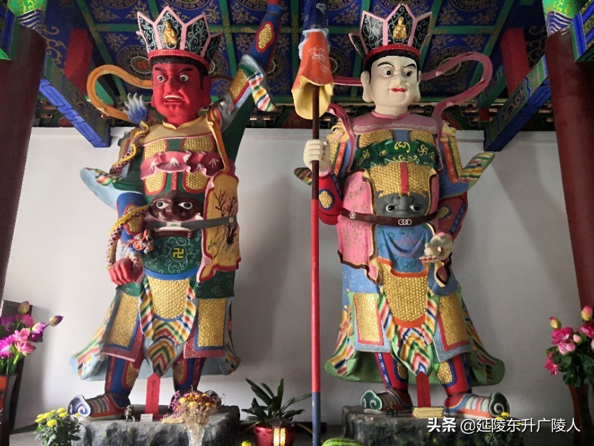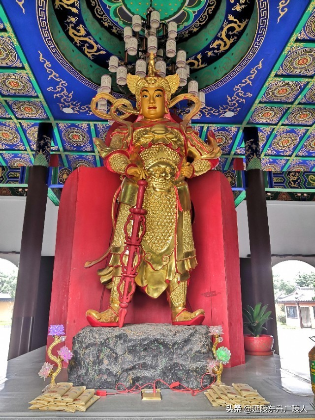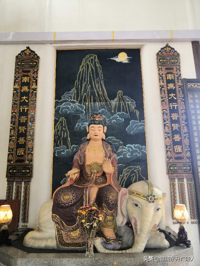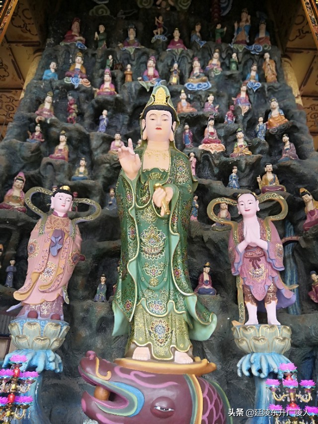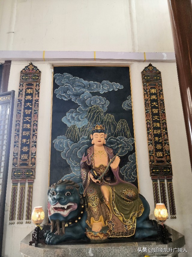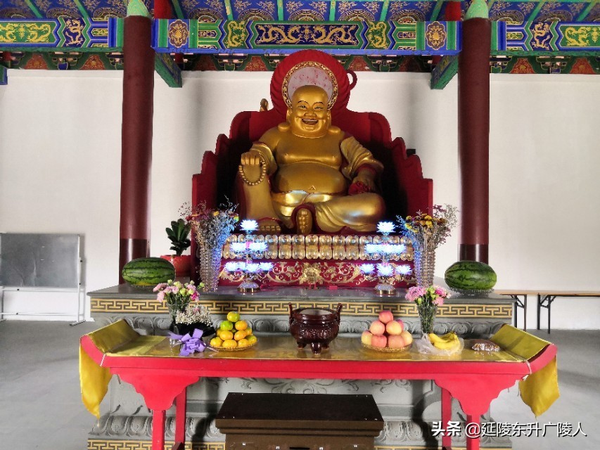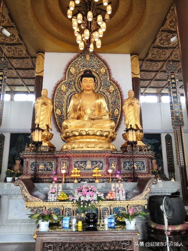 天王殿的广场前是一个巨大仿青铜长方鼎的石制香炉,步入天王殿,正中供奉弥勒佛,两侧是四大天王,背面是韦陀菩萨。供佛的除了鲜花水果外,还有小包装的糕点,竟然还有桶装的食用调和油,水果中也有整只重达二三十斤的大西瓜,是不是感觉到纯朴礼佛的诚心。天王殿后面是大雄宝殿,正中供奉释迦牟尼,两边侍立两大弟子迦叶和阿难,背面是以观音菩萨领衔的海岛,大殿两侧是金妆的十八罗汉,东北和西北角有骑狮吼的文殊菩萨和骑白象的普贤菩萨。