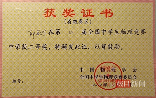 近日,第41届全国中学生物理竞赛决赛获奖名单出炉,武汉市青山区钢都中学郭家宁同学,经过初赛、复试实验考试和复试理论考试,最终获得全国二等奖;该校也成为全市市示范高中里唯一一所获此殊荣的学校。