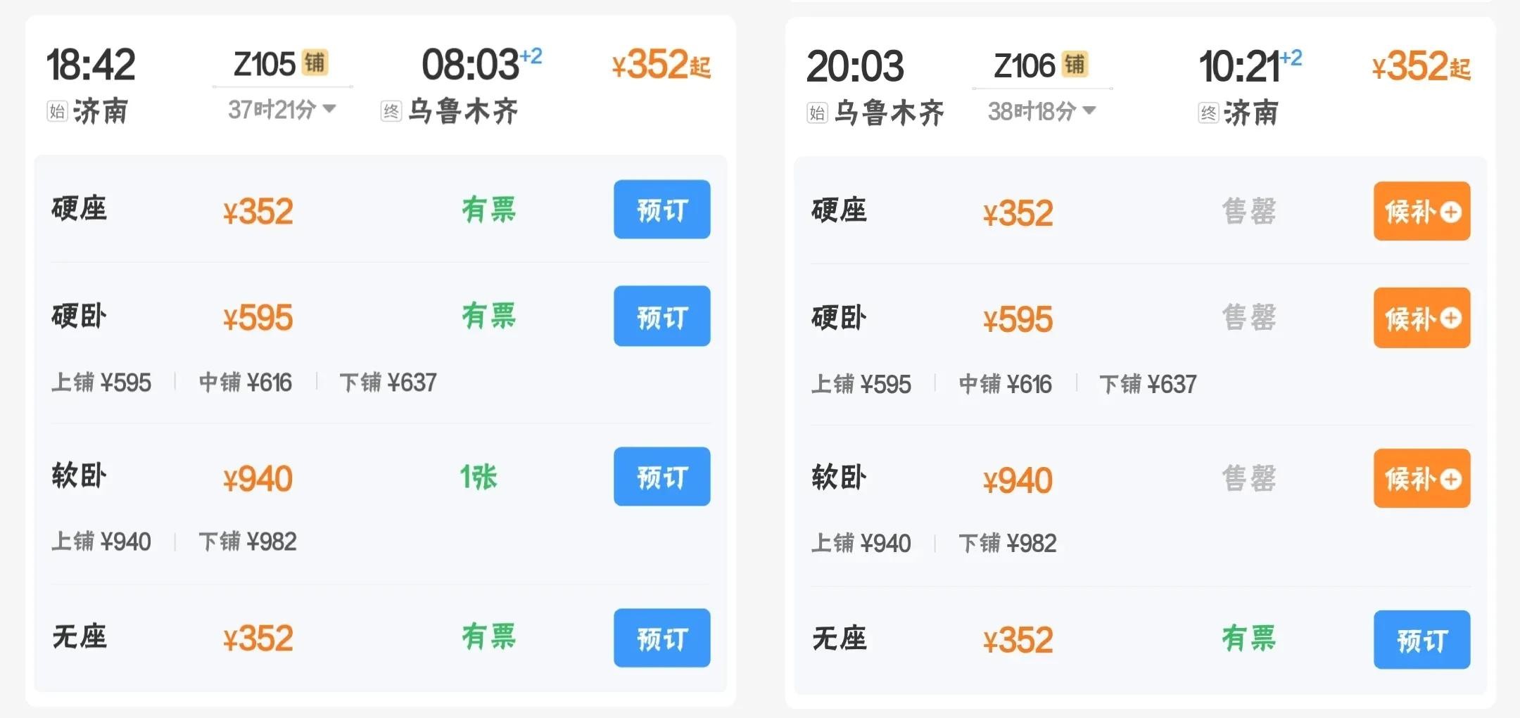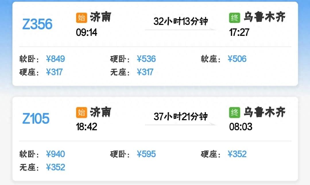济南有两趟火车到乌鲁木齐,而且都是直达,一趟是Z356次列车,一趟是Z105次列车。