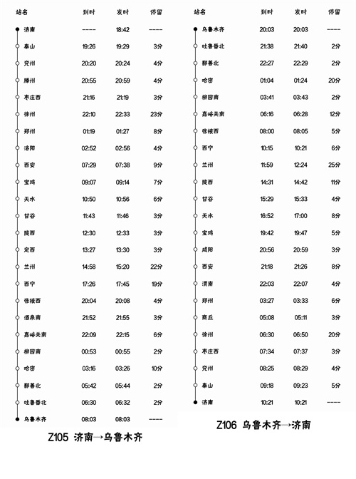 济南站开往乌鲁木齐站Z105次列车,历时37个小时,3650公里