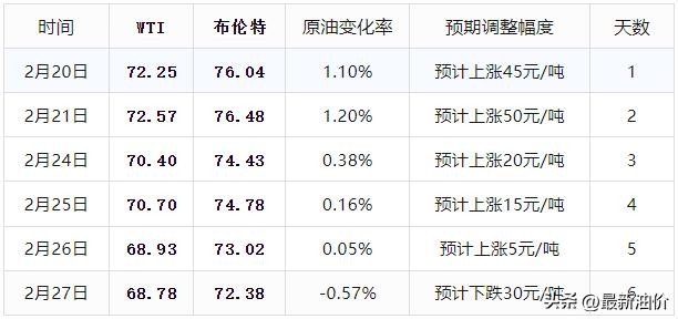 2月27日,国内第5个工作日统计,参考原油变化率-0.57%,预计汽柴油下跌30元/吨,逐步接近50元/吨的下调标准。油价调整时间在3月5日24时!
