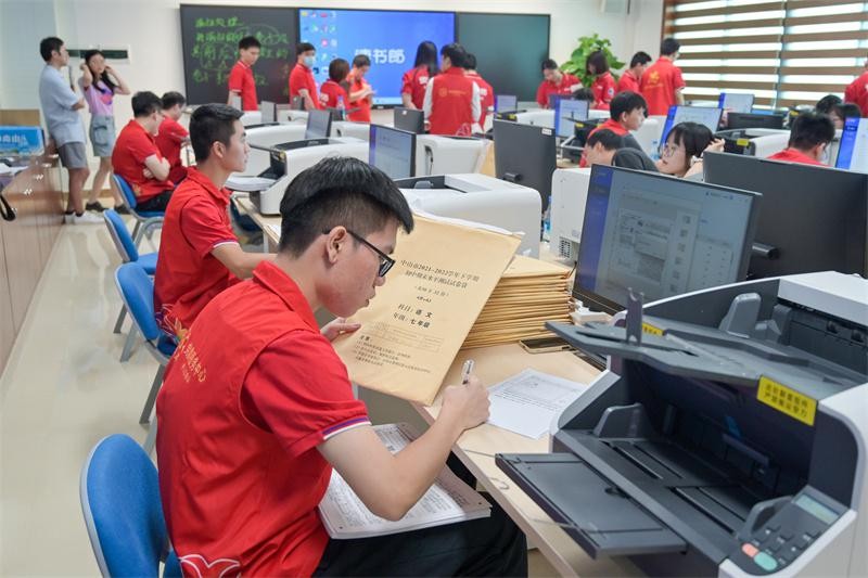 记者在读书郎公司看到,一批批密封好的试卷经过运输到达指定地点,一个个身穿红色马甲的志愿者将试卷整理好,扫描仪自动扫描,试卷极速上传进入阅卷系统,一秒钟即可自动扫描两三张试卷。