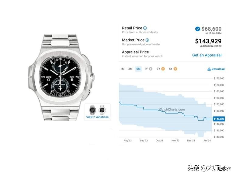 两地计时码表是百达翡丽时计中比较罕见的不锈钢腕表,功能比较实用,复杂功能:飞返计时、旅行时间(双时区,包括两枚独立时针,中间的为原居地时间)以及与当地时间同步的计时显示,这款腕表在高端运动计时领域比较受关注,如今溢价达到了109.8%,来到了110附近,二手也在90多以上。