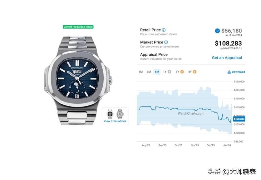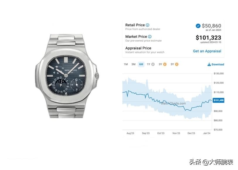 钢表的进阶版还有年历款月相鹦鹉螺,这只腕表非常实用比动能储备版在市面上更受欢迎,所以在溢价上也高于前者,年历款是百达翡丽的复杂制表精髓,取得了一系列重要工艺突破,溢价后在105-110,目前二手也要在90左右,未来这只腕表应该还会平稳上升。