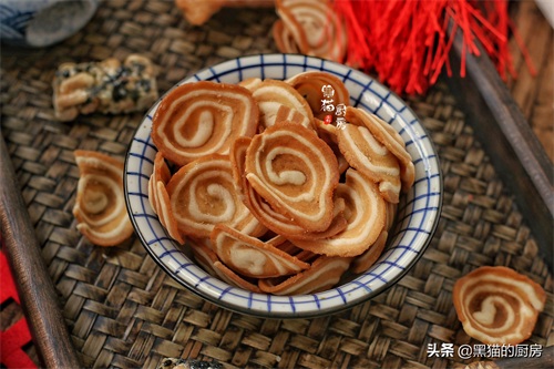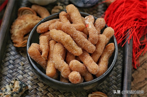 鲍鱼酥里没有鲍鱼,只是因为外形相似,所以名字里有“鲍鱼”二字。鲍鱼酥也是油炸食物,加了泡打粉的鲍鱼酥香酥可口,鲍鱼原本是比较昂贵的海产食材,用面粉做成形似鲍鱼的贺年小吃,过年摆桌上,非常讨喜。