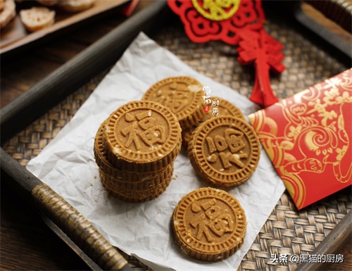 炒米饼是用粘米粉做的,也就是大米粉,属于客家人的传统小吃,平时也能买得到,但过年期间,炒米饼上面会有各种不同的模具刻出来的字,福、富、禄、贵、财、旺等寓意吉祥的字样,摆在贺年果盘里,寓意好。