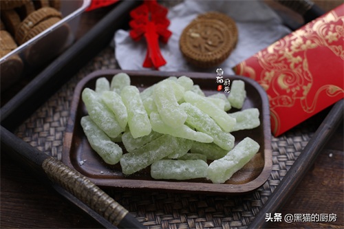 糖冬瓜寓意团团圆圆,食材用的是新鲜的冬瓜煮熟后拌白糖晒干而成,冬瓜本就有止渴生津清热的作用,过年小吃和各种油炸食物吃多了,来一块糖冬瓜,清甜可口、爽脆润喉,相信喜甜的甜品控会很喜欢哦。