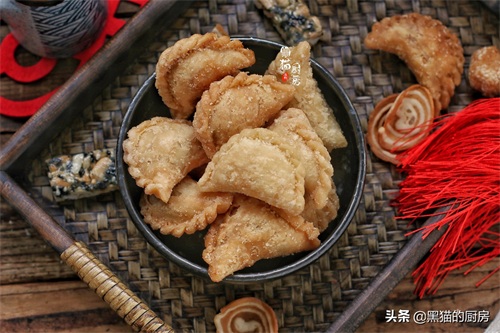 油角,也叫酥角,寓意荷包鼓鼓,在北方人眼里,这是迷你的小饺子,它的面皮主要用鸡蛋、猪油和面粉三种材料,内馅一般是白糖、黑白芝麻、花生这几样,因为油角特别小,折边的时候别漏了,否则下油锅后容易开裂,白糖遇高温容易变黑,所以包这小酥角也要格外注意。