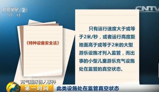 而按我国的《特种设备安全法》,只有运行速度大于或等于2米/秒,或者运行高度距地面高于或等于2米的大型游乐设施才列入监管,而出事的小型儿童游乐充气设施处在监管的真空状态。同样的隐患,相似的场景,相同的悲剧,漠视安全的经营者难辞其咎,我们同时也希望相关监管部门尽快出台监管措施,不让悲剧再重演。