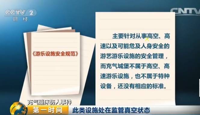 据了解,目前现行的《游乐设施安全规范》主要是针对从事高空、高速以及可能危及人身安全的游艺游乐设施的安全管理,而充气城堡不属于高空、高速游乐设施,也不属于特种设备,所以还没有相应的标准。