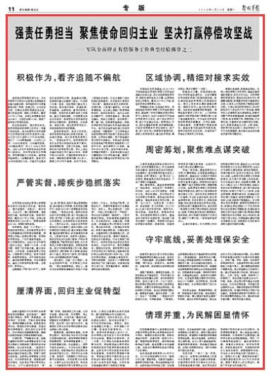 停止有偿服务,这是深化国防和军队改革的重要举措,是让军队回归使命、聚焦军事核心能力建设的英明决策,是纯洁部队风气的有力抓手,对于实现党在新形势下的强军目标具有重大现实意义和深远战略意义。那么,有哪些工作典型经验可参考借鉴呢?请关注今日出版的《解放军报》的详细报道——