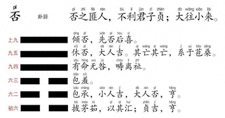 否卦,是天地闭塞不交,万物不通,是导致万事万物不能顺利发展的原因。内阴而外阳,指的是内卦为坤卦,外卦为乾卦,故“内小人而外君子”。小人渐渐得势,而君子渐渐失势。