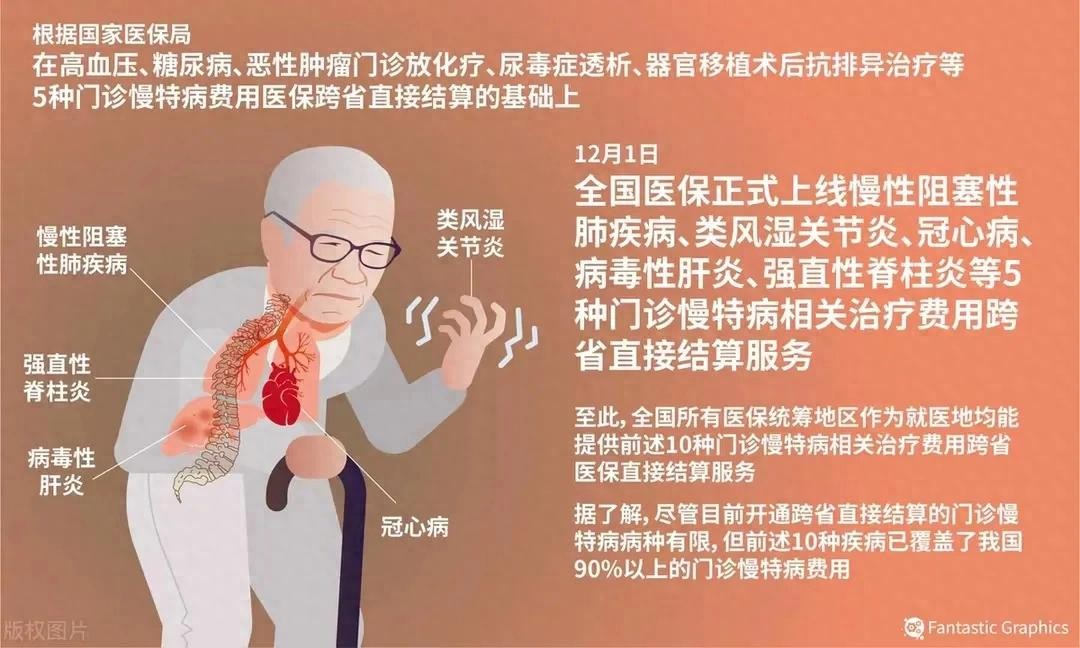 国家医保局办公室会同财政部办公厅印发了《关于稳妥有序扩大跨省直接结算门诊慢特病病种范围的通知》,决定将跨省直接结算门诊慢特病病种数量从5种增加到10种。新增的5种门诊慢特病包括慢性阻塞性肺疾病、类风湿关节炎、冠心病、病毒性肝炎、强直性脊柱炎等 。