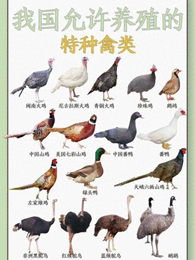在我国,养殖特种禽类已成为农业业务中的一个重要方面。特种禽类指的是那些在食用、观赏和经济价值方面都相对特殊的禽鸟。这些禽鸟不仅拥有丰富多样的品种,而且具有独特的生态特点和经济效益。我国允许养殖的特种禽类有很多种类,下面将重点介绍一些常见的特种禽类。