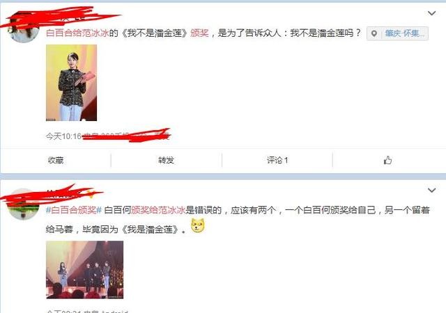 网友评论“白百合给范冰冰的《我不是潘金莲》颁奖,是为了告诉众人:我不是潘金莲吗?”,“ 白百何颁奖给范冰冰是错误的,应该有两个,一个白百何颁奖给自己,另一个留着给马蓉,毕竟因为《我是潘金莲》。”