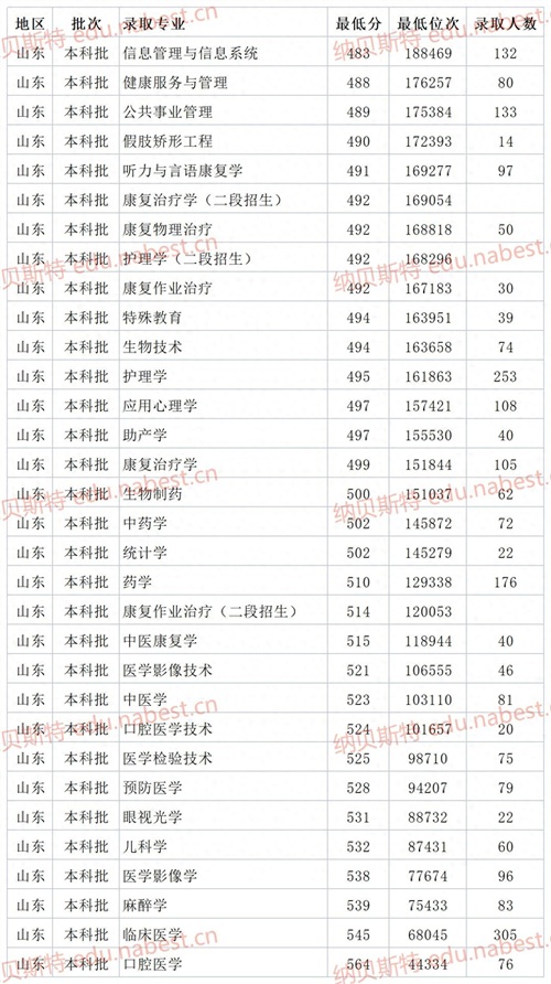 滨州医学院是山东省应用型本科高校,是一所以医药学科为优势,残疾人高等教育、康复高等教育为特色的省属本科医学院校。滨州医学院目前高考统招、单招等,均只设置了本科专业招生,一般有普通本科批、地方免费医学生、单独考试招生等类型,目前公布有2021年高考统招省内普通本科批次各专业录取分数线信息。