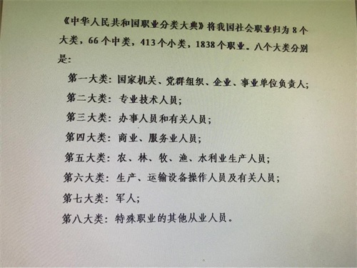根据《》中华人民共和国职业分类大典》将我国社会职业归为8个大类,66个中类,413个小类,1838个职业。八个大类分别是: