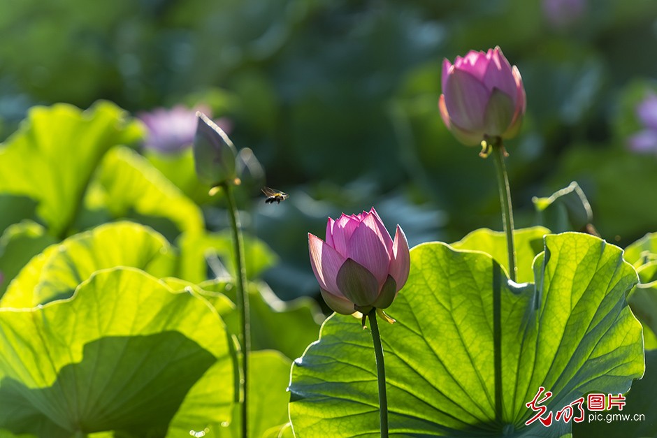 2019年7月18日,每到夏日,李村河中的荷花傲立枝头,景色宜人。(辛若珂 摄/光明图片)