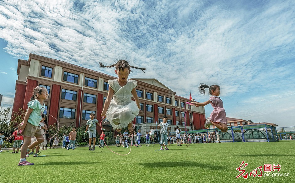 2019年9月11日,在新建的哲范小学,课间休息时间孩子们在跳绳。幼有所教,学有所乐。每一名李沧学子都能够沐浴着新时代的东风,启航梦想的征程。(辛若珂 摄/光明图片)