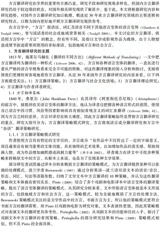 方言翻译涉及许多复杂问题。近30年来,国际上方言翻译研究渐受重视,成果丰富。本文着重梳理国外方言翻译研究脉络,特别是方言翻译策略、方言翻译与社会文化语境、方言翻译理论研究、方言翻译与作者译者研究等方面的主要进展和观点。作者据此进一步总结归纳了近30年来国外方言翻译研究的特点和趋势,以及存在的问题。