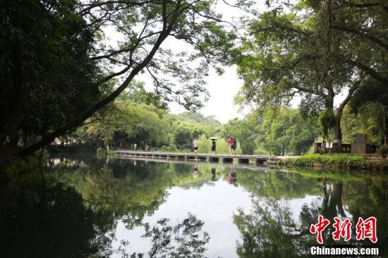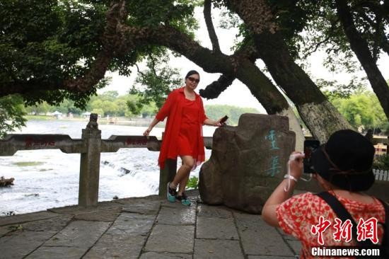 游客在灵渠边上留影。 朱柳融 摄