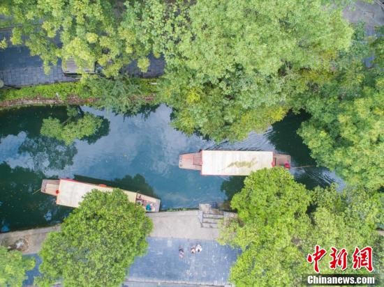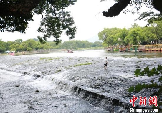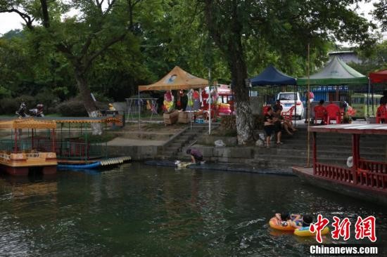 8月14日,在广西桂林市兴安县灵渠景区内,游客乘坐游船游历灵渠时,当地居民在灵渠洗衣、游泳。始建于2200多年前的灵渠,是沟通长江流域的湘江和珠江流域的漓江的跨水域水利工程,是世界上最古老的运河之一。 王以照 摄