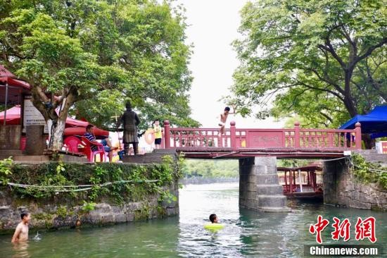 一名小朋友从灵渠内的天下第一陡跳下游泳。 朱柳融 摄