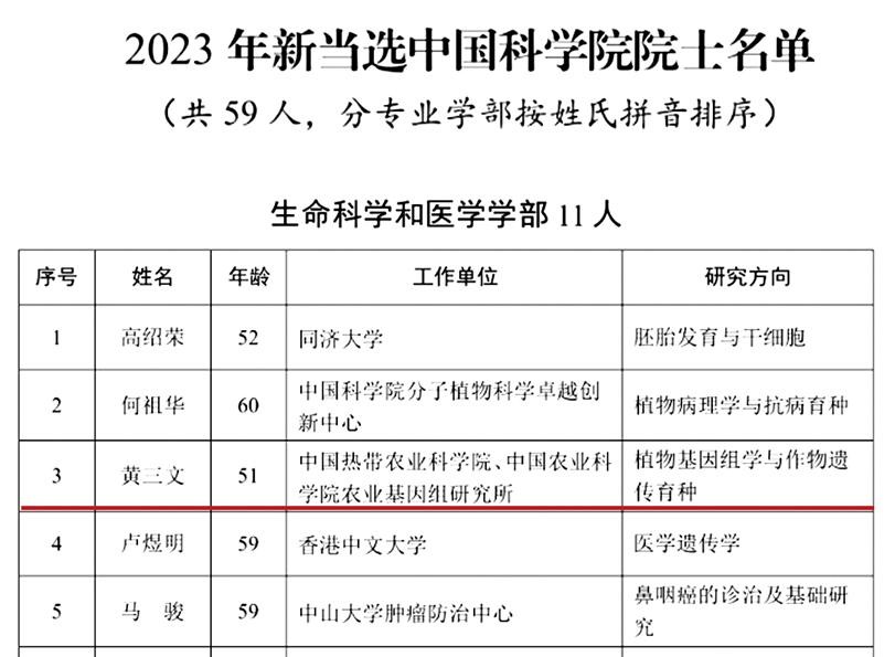 2021年黄三文曾入围中国科学院院士候选人名单,2023年中国科学院选举产生了59名中国科学院院士,黄三文名列生命科学和医学学部类院士名单。