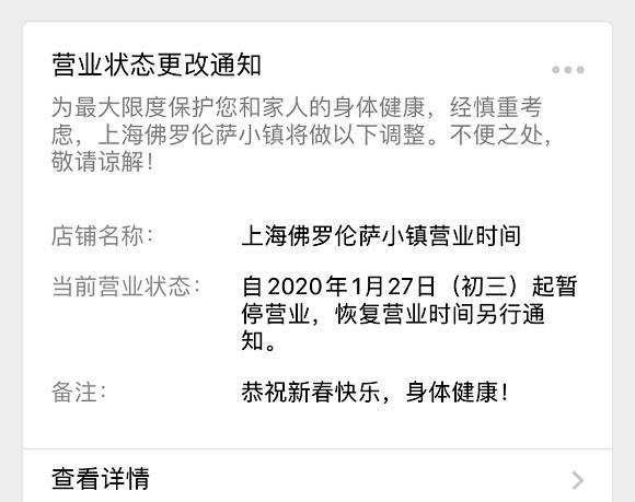 上海佛罗伦萨小镇发布公告,自2020年1月27日(初三)起暂停营业,恢复营业时间另行通知。