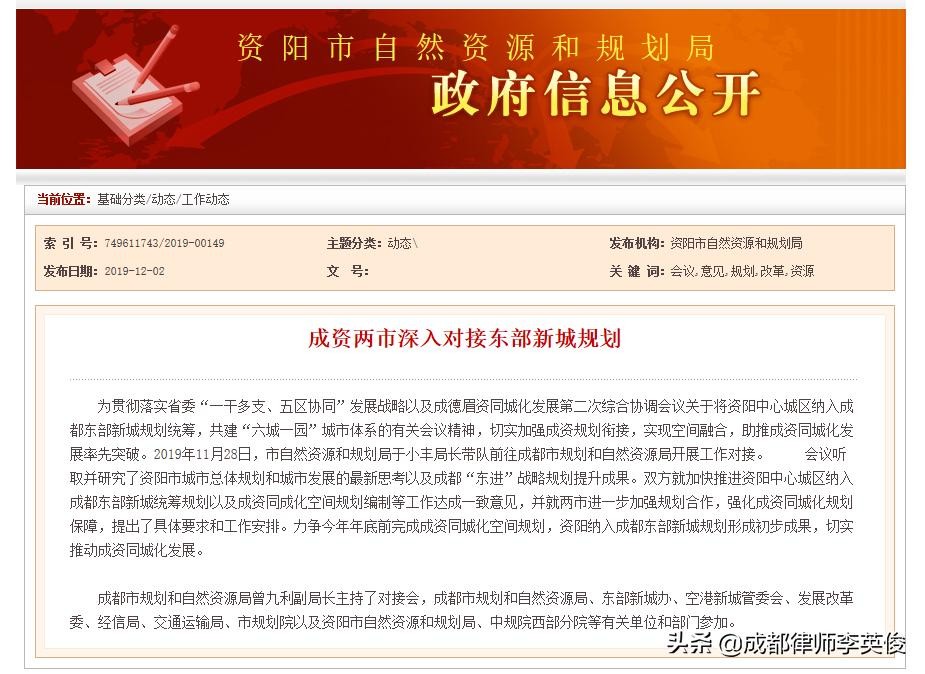 为贯彻落实省委“一干多支、五区协同”发展战略以及成德眉资同城化发展第二次综合协调会议关于将资阳中心城区纳入成都东部新城规划统筹,共建“六城一园”城市体系的有关会议精神,切实加强成资规划衔接,实现空间融合,助推成资同城化发展率先突破。2019年11月28日,市自然资源和规划局于小丰局长带队前往成都市规划和自然资源局开展工作对接。