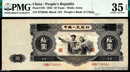 2:1953年第二版人民币拾圆,工农像图,俗称“大黑十”,苏联代印,PMG 35 EPQ,成交价格: RMB 529000