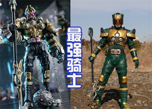 最后就是假面骑士Leangle,也就是有最强骑士称号的。但是假面骑士Leangle只有一个形态,而在sic手办中,喜获一个新的形态。这个是侍卫形态,假面骑士Leangle的身体上多了很多金色的装甲。手臂变得非常巨大,其中一条手臂拿着巨大的锤子,而另一手臂中拿着进化后的法杖,法杖的另一端多了锋利的长刃,看起来很帅气。