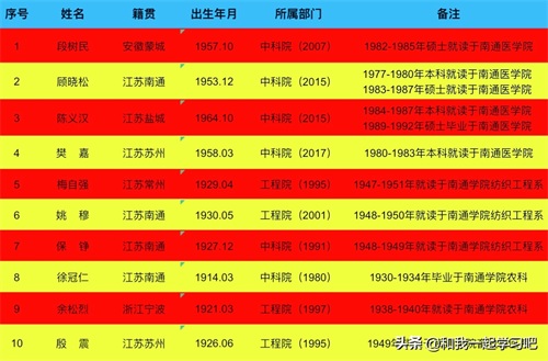 作为一所百年老校,南通大学培养了一批又一批的优秀人才,他们有的成为国之栋梁,有的成为行业精英,其中最值得骄傲的是徐冠仁、保铮、殷震、梅自强、余松烈、姚穆、段树民、顾晓松、陈义汉、樊嘉这10位从南通大学走出的两院院士。