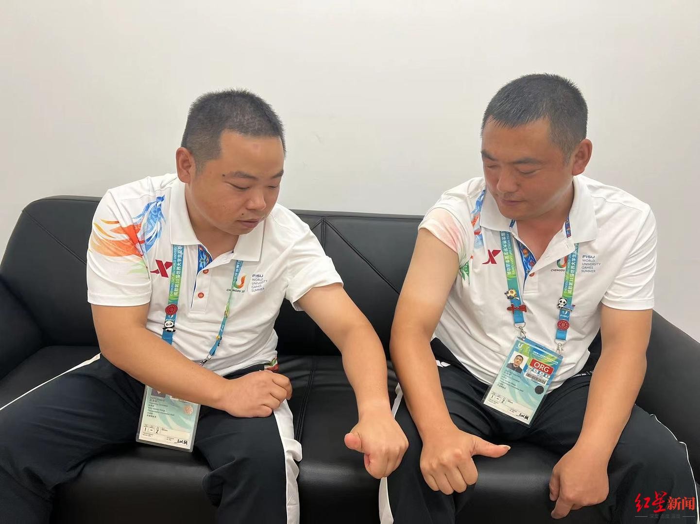 在成都大运会运动员村交通服务口,有这样两兄弟,因外形相似、工作形影不离,他们被同事戏称“哼哈二将”。其中,个头稍高的叫沈传荣,他的短袖下面,是黑白两截明显不同的肤色;而个子矮一点的叫周泽刚,他的额头右边有一个圆形小疤,是被太阳晒伤后的样子。
