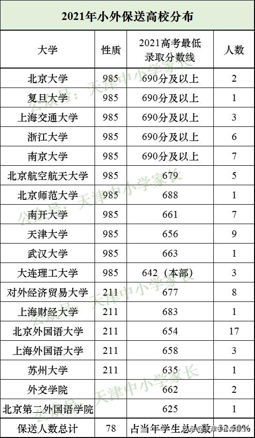 第三,小外高中具有保送资格,是全国具有推荐保送生资格的16所外国语中学之一,每年有三分之一学生被保送至各重点大学,下图为近两年保送情况汇总,所有专业均为语言类,而这优势对于很多孩子来讲可能也是劣势,虽然就业单一,但是绝对不愁就业,不说985/211,看看外交学院和北二外你就有感触了。不过如果不想语言类保送,小外中考可以考市五所等普通高中,高考也可以通过裸分去考取其他大学或专业。