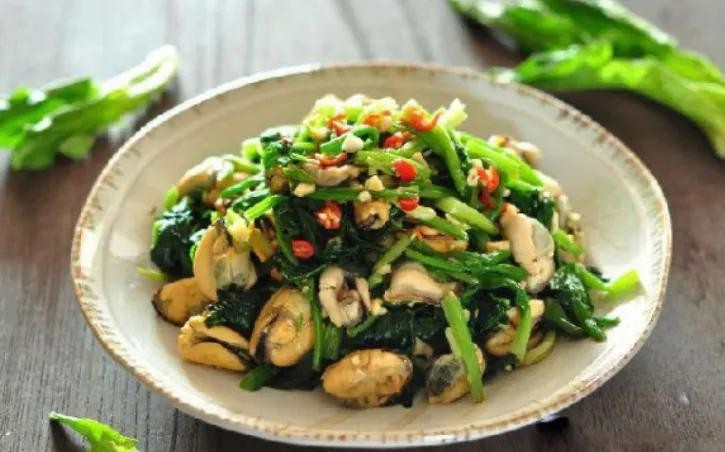 3. 将菠菜清洗干净,焯水后切段,跟海虹放在大碗里