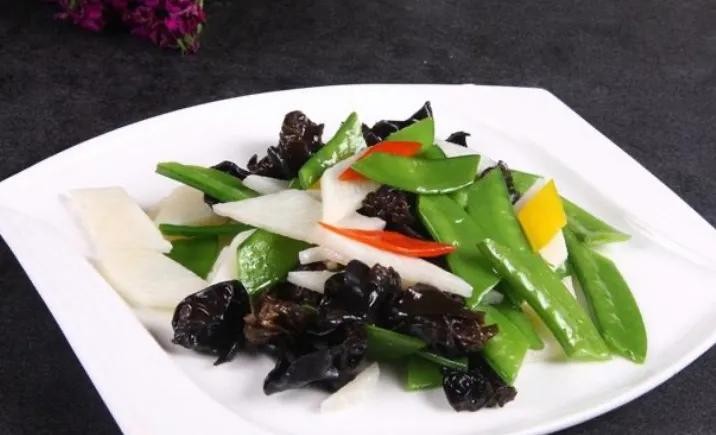 4.三十秒后可依次放山药、木耳、百合、辣椒,两分钟后盛出沥干水分备用