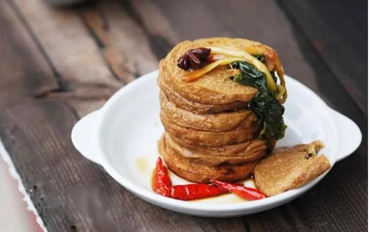 1.将素鸡切片,锅中倒入油,素鸡片放入,用大火煎至起泡,翻面继续