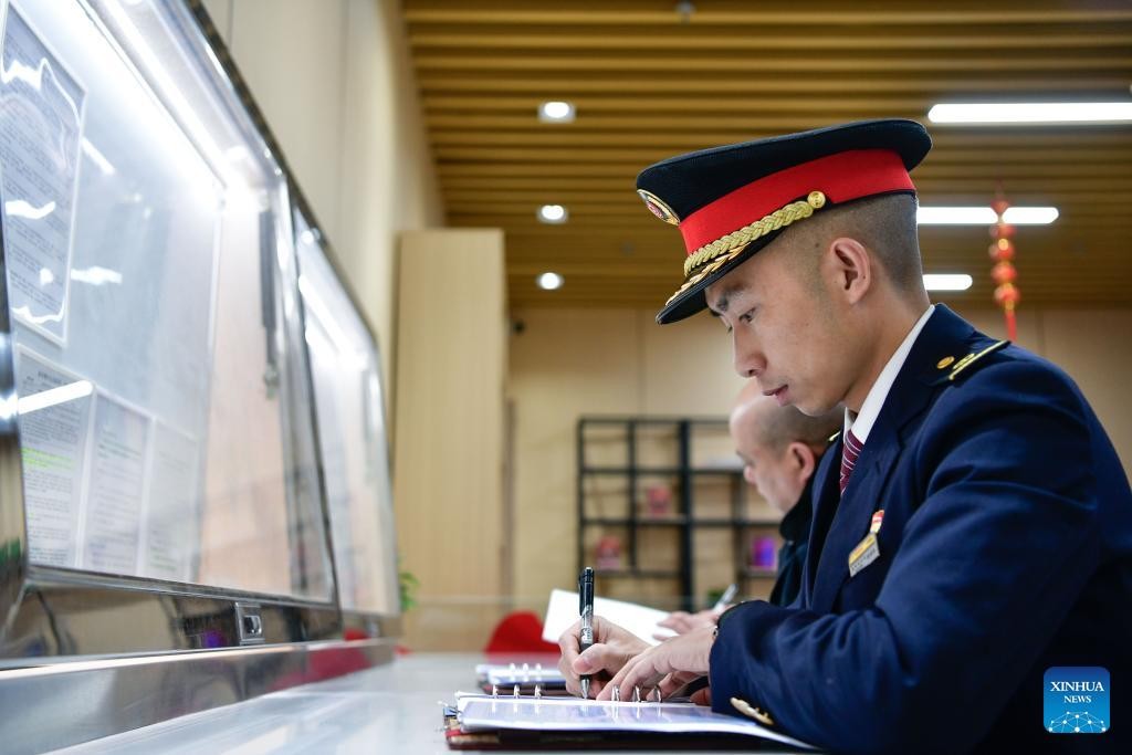 Lu Jinsheng transcribes precautions before embarking on his duty at a bullet train workshop in Guiyang, southwest China's Guizhou Province, Feb. 7, 2025. (Xinhua/Yang Wenbin)