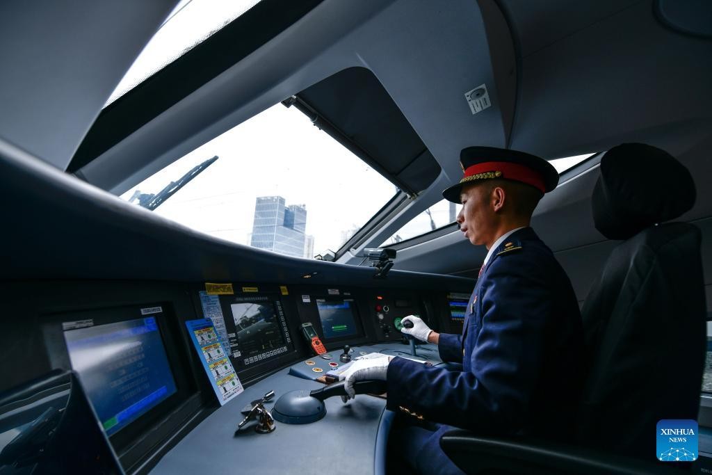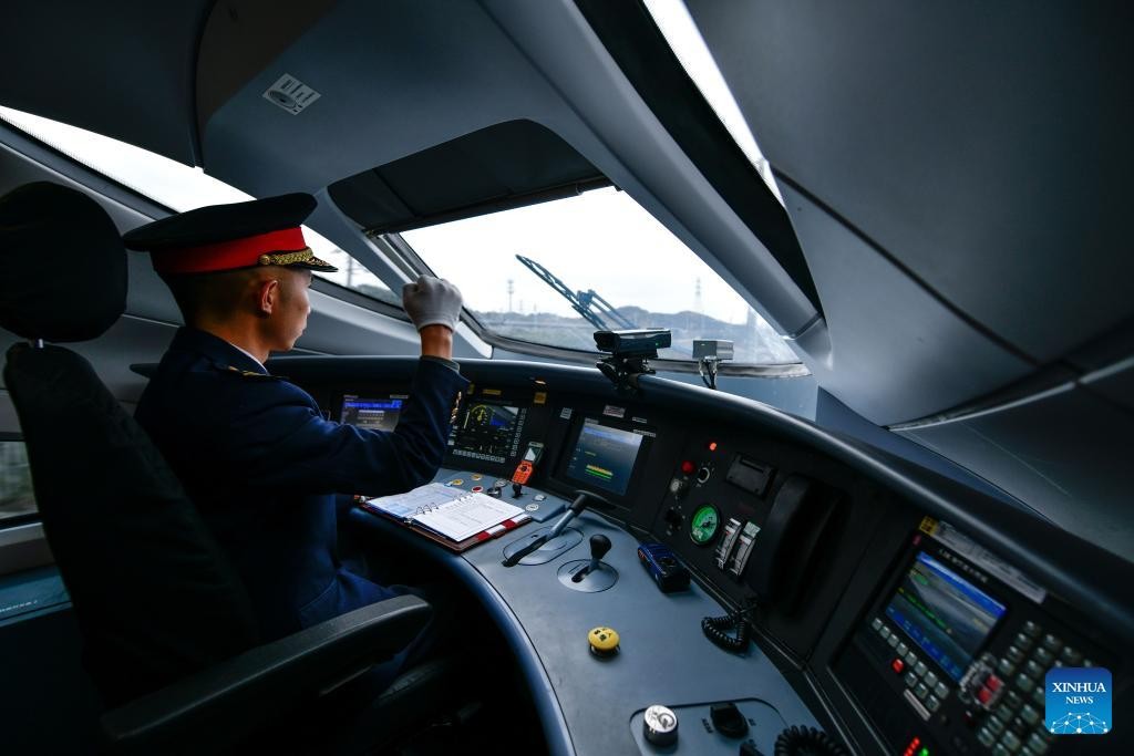 Lu Jinsheng drives a bullet train on the Guiyang-Nanning high-speed railway on Feb. 7, 2025. (Xinhua/Yang Wenbin)