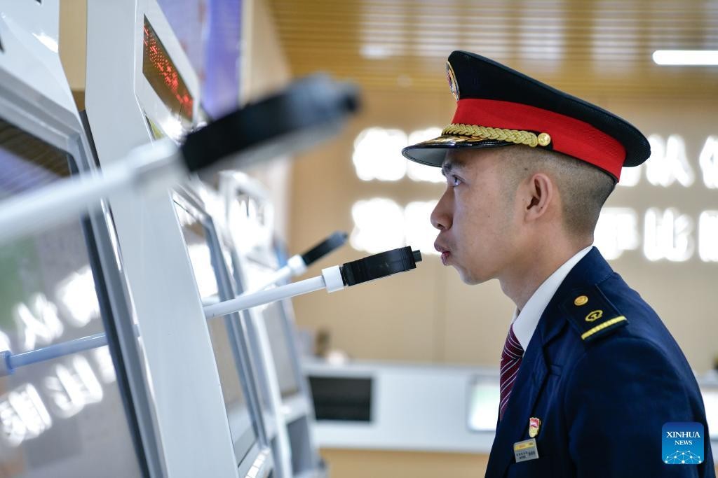 Lu Jinsheng takes an alcohol test before embarking on his duty at a bullet train workshop in Guiyang, southwest China's Guizhou Province, Feb. 7, 2025. (Xinhua/Yang Wenbin)