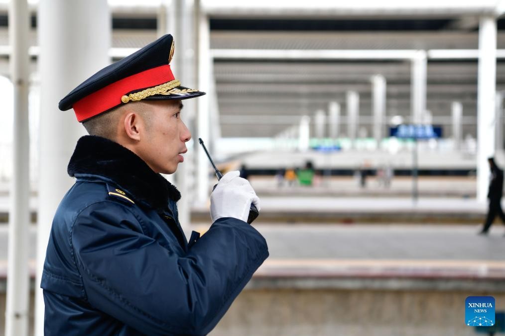 Lu Jinsheng talks with a train conductor on duty on an interphone at Guiyang north station in Guiyang, southwest China's Guizhou Province, Feb. 7, 2025. (Xinhua/Yang Wenbin)