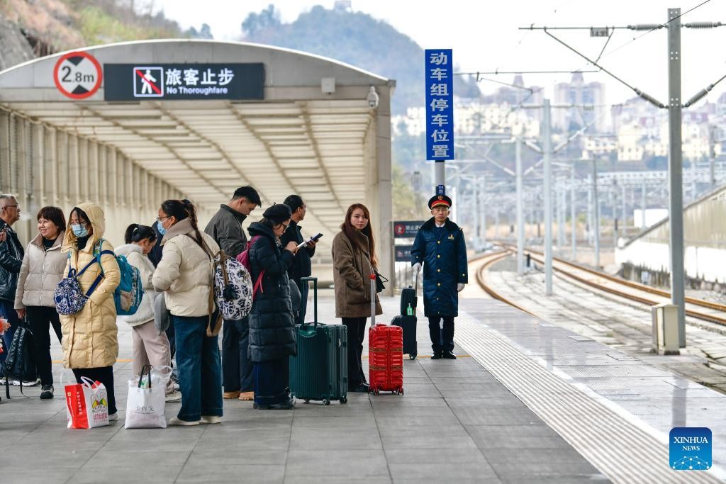 Lu Jinsheng (1st R) waits for a train to arrive at Guiyang north station in Guiyang, southwest China's Guizhou Province, Feb. 7, 2025. (Xinhua/Yang Wenbin)