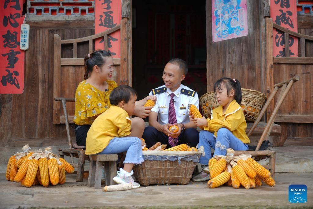 Lu Jinsheng, his wife and children peel corn at their home in Mingying Village, Yundong Township, Duyun City of southwest China's Guizhou Province, Aug. 23, 2023. (Photo by Long Jianrui/Xinhua)